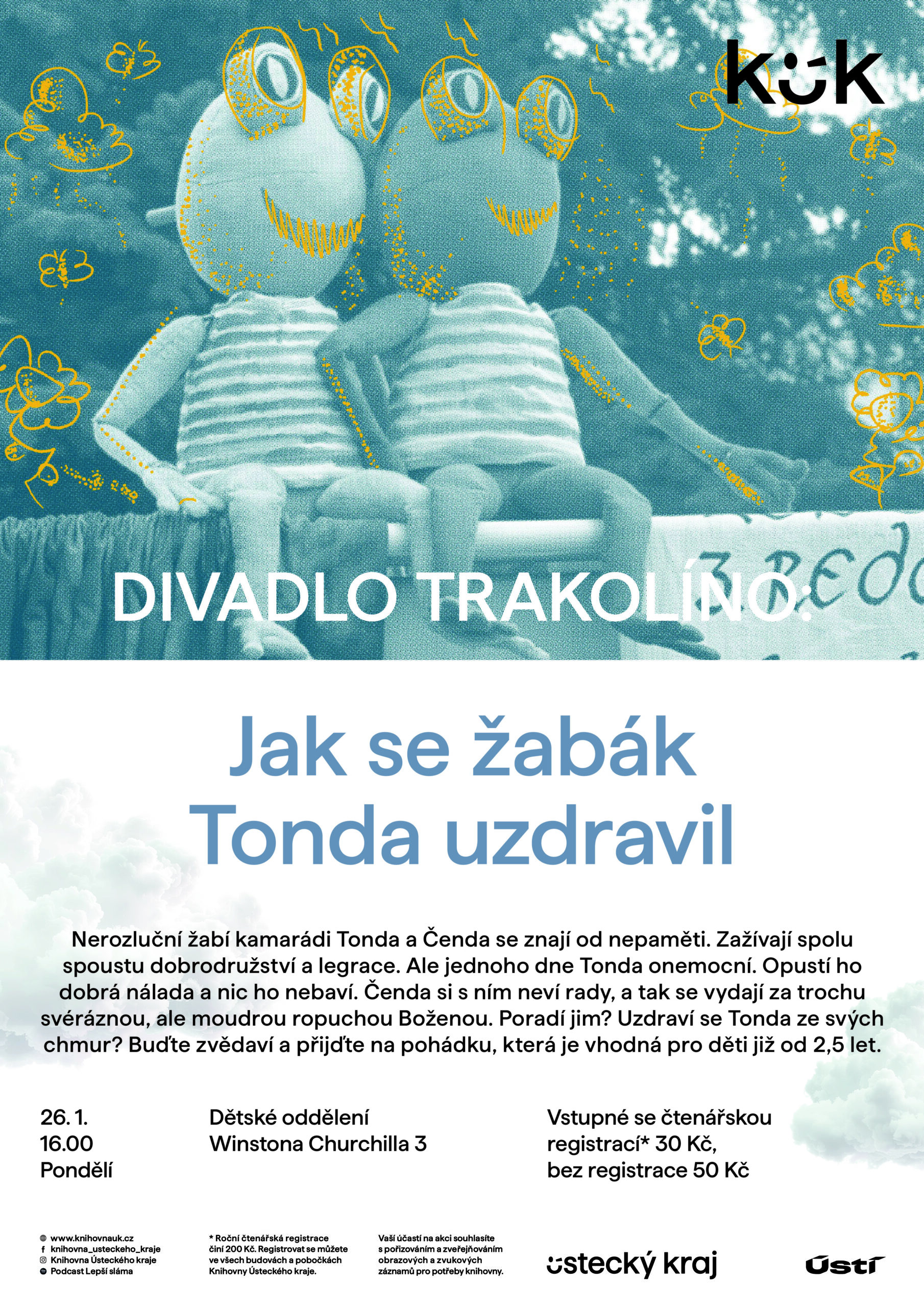 Nerozluční žabí kamarádi Tonda a Čenda se znají od nepaměti. Zažívají spolu spoustu dobrodružství a legrace. Ale jednoho dne Tonda onemocní. Opustí ho dobrá nálada a nic ho nebaví. Čenda si s ním neví rady, a tak se vydají za trochu svéráznou, ale moudrou ropuchou Boženou. Poradí jim? Uzdraví se Tonda ze svých chmur? Buďte zvědaví a přijďte na pohádku, která je vhodná pro děti již od 2,5 let.