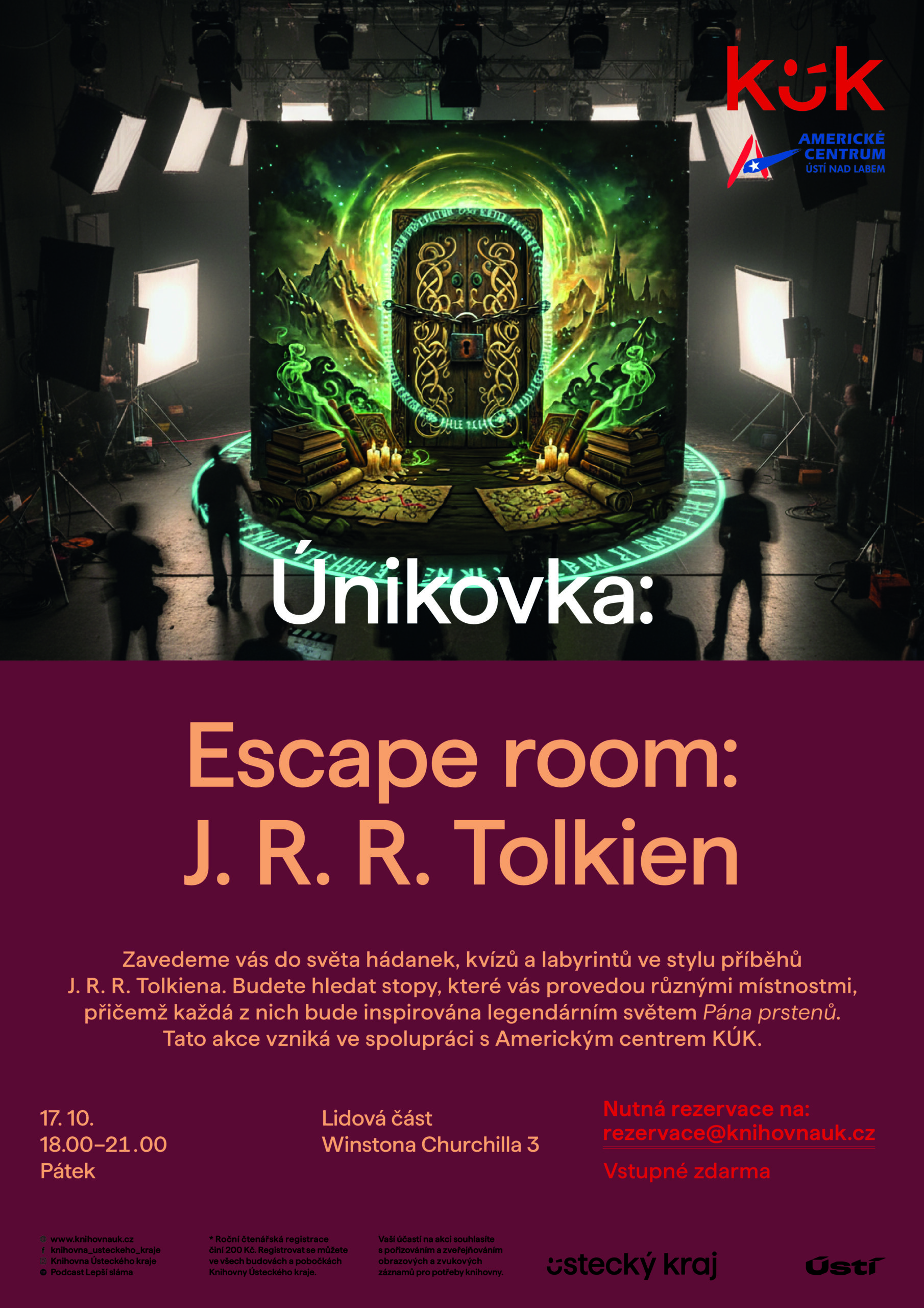Zavedeme vás do světa hádanek, kvízů a labyrintů ve stylu příběhů J. R. R. Tolkiena. Budete hledat stopy, které vás provedou různými místnostmi, přičemž každá z nich bude inspirována legendárním světem Pána prstenů. Tato akce vzniká ve spolupráci s Americkým centrem KÚK.