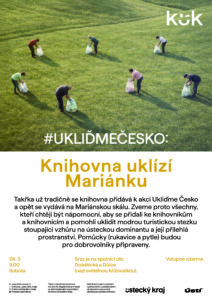 Takřka už tradičně se knihovna přidává k akci Ukliďme Česko a opět se vydává na Mariánskou skálu. Zveme proto všechny, kteří chtějí být nápomocní, aby se přidali ke knihovníkům a knihovnicím a pomohli uklidit modrou turistickou stezku stoupající vzhůru na ústeckou dominantu a její přilehlá prostranství. Pomůcky (rukavice a pytle) budou pro dobrovolníky připraveny.