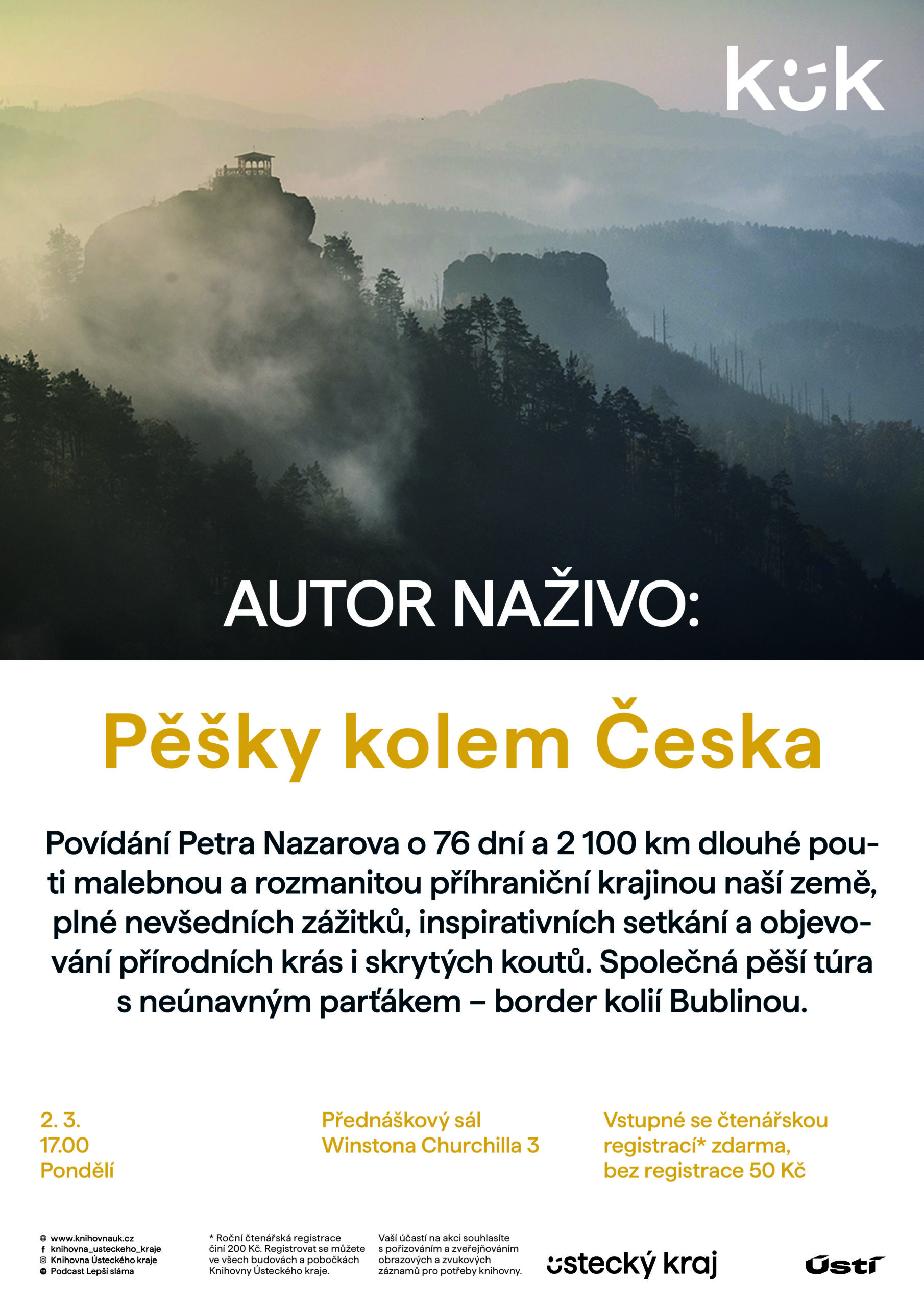 Povídání Petra Nazarova o 76 dní a 2 100 km dlouhé pouti malebnou a rozmanitou příhraniční krajinou naší země, plné nevšedních zážitků, inspirativních setkání a objevování přírodních krás i skrytých koutů. Společná pěší túra s neúnavným parťákem – border kolií Bublinou.