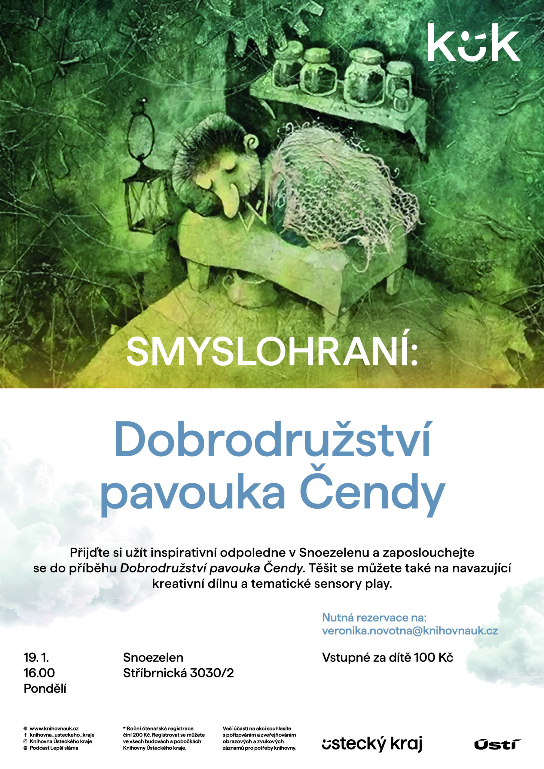 Přijďte si užít inspirativní odpoledne v Snoezelenu a zaposlouchejte se do příběhu Dobrodružství pavouka Čendy. Těšit se můžete také na navazující kreativní dílnu a tematické sensory play.
