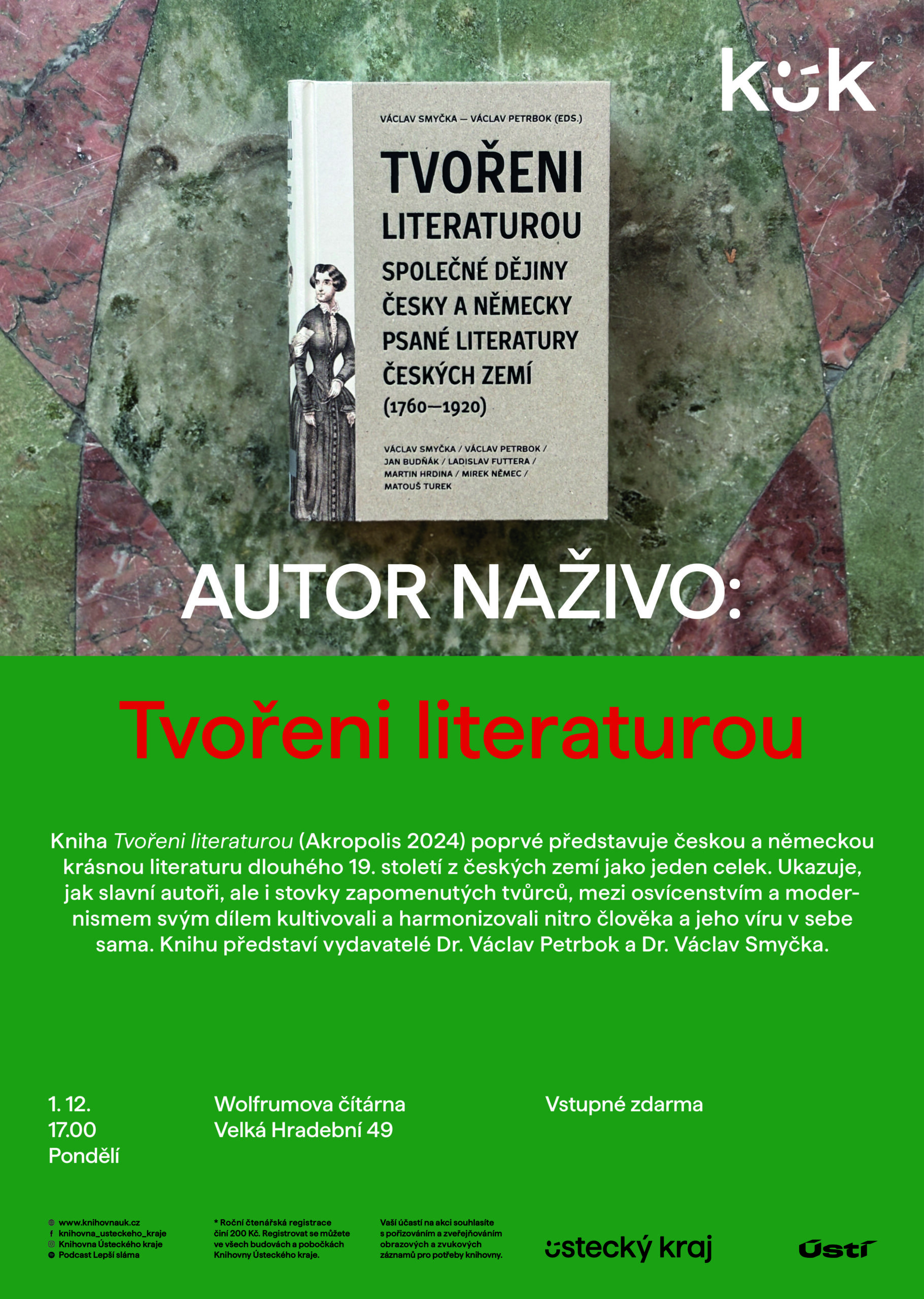 Kniha Tvořeni literaturou (Atlantis 2025) poprvé představuje českou a německou krásnou literaturu dlouhého 19. století z českých zemí jako jeden celek. Ukazuje jak slavní autoři, ale i stovky zapomenutých tvůrců mezi osvícenstvím a modernismem svým dílem kultivovali a harmonizovali nitro člověka a jeho víru v sebe sama. Knihu představí vydavatelé Dr. Václav Petrbok a Dr. Václav Smyčka.