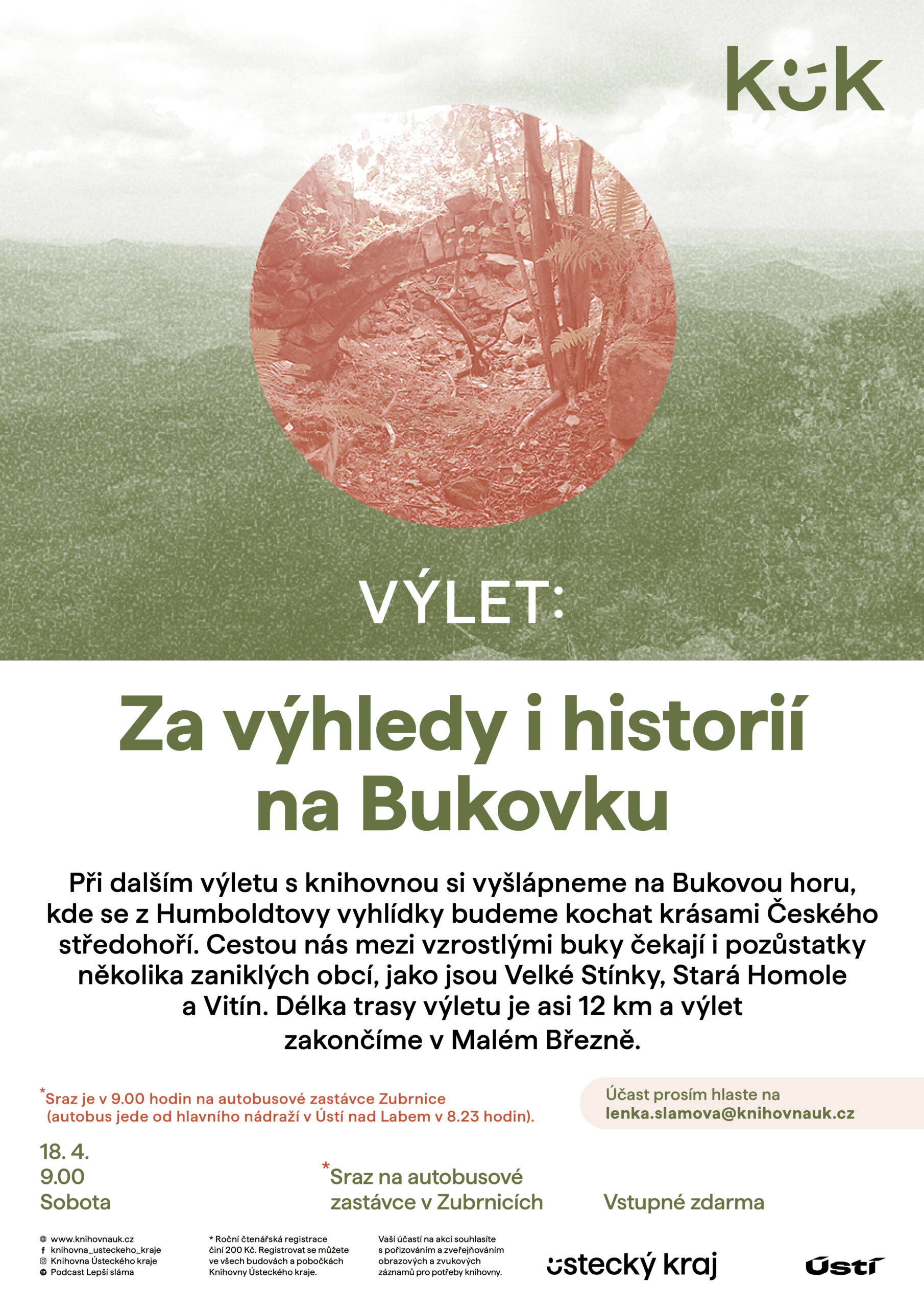 Při dalším výletu s knihovnou si vyšlápneme na Bukovou horu, kde se z Humboldtovy vyhlídky budeme kochat krásami Českého středohoří. Cestou nás mezi vzrostlými buky čekají i pozůstatky několika zaniklých míst, jako jsou Velké Stínky, Stará Homole a Vitín. Délka trasy výletu je asi 12 km a výlet zakončíme v Malém Březně.