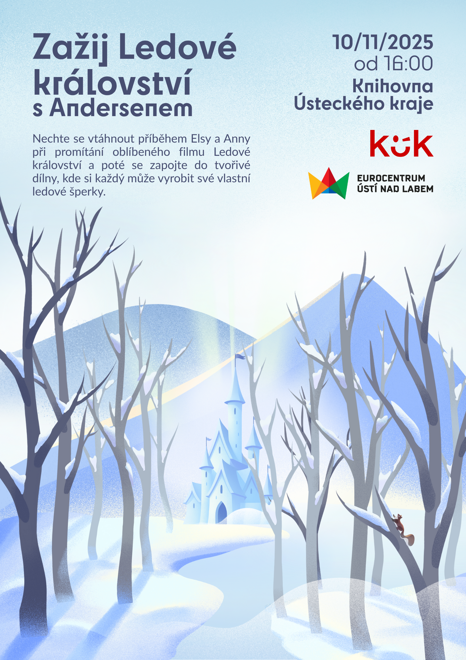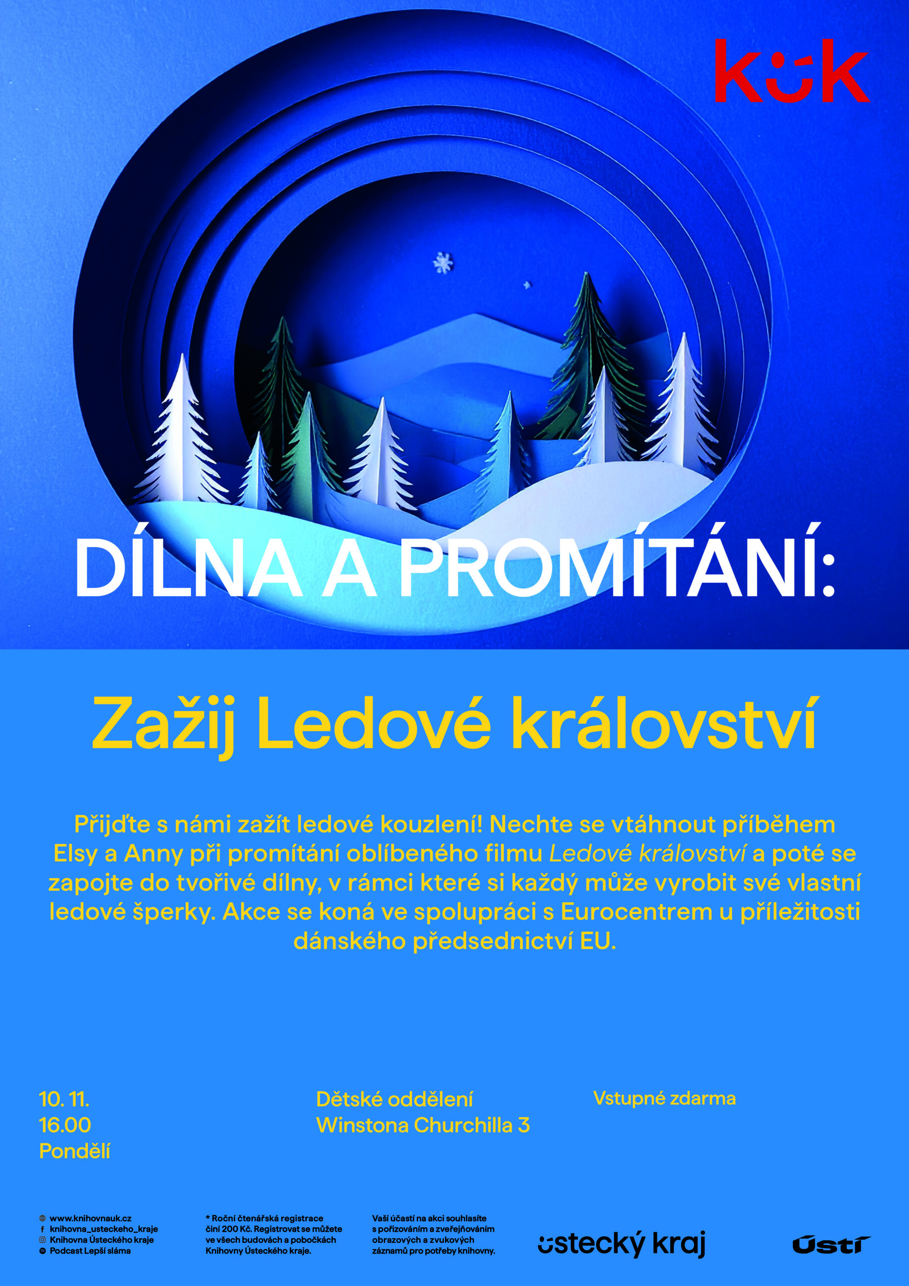 Přijďte s námi zažít ledové kouzlení! Nechte se vtáhnout příběhem Elsy a Anny při promítání oblíbeného filmu Ledové království a poté se zapojte do tvořivé dílny, v rámci které si každý může vyrobit své vlastní ledové šperky. Akce se koná ve spolupráci s Eurocentrem u příležitosti dánského předsednictví EU.